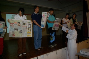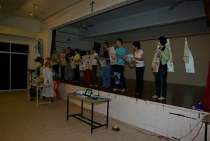第一天的讲座开始前,王神父先诵念一段福音、领教友们咏唱一些圣歌及诸圣祷文。跟着神父邀请十位教友各拿一张报纸,那是十天内发生的事故,主要的内容是有关马来西亚人自杀的新闻。神父提出为什么人要自杀的问题,他亦给我们无数的案例,并一再强调家庭内父母对孩子的影响非常的重要。孩子是天主赐给父母的,是天主让我们暂时照顾的,父母除了生、养还得教育及爱他们。作为父母的,是否有好好的照顾这天主委托的使命呢?