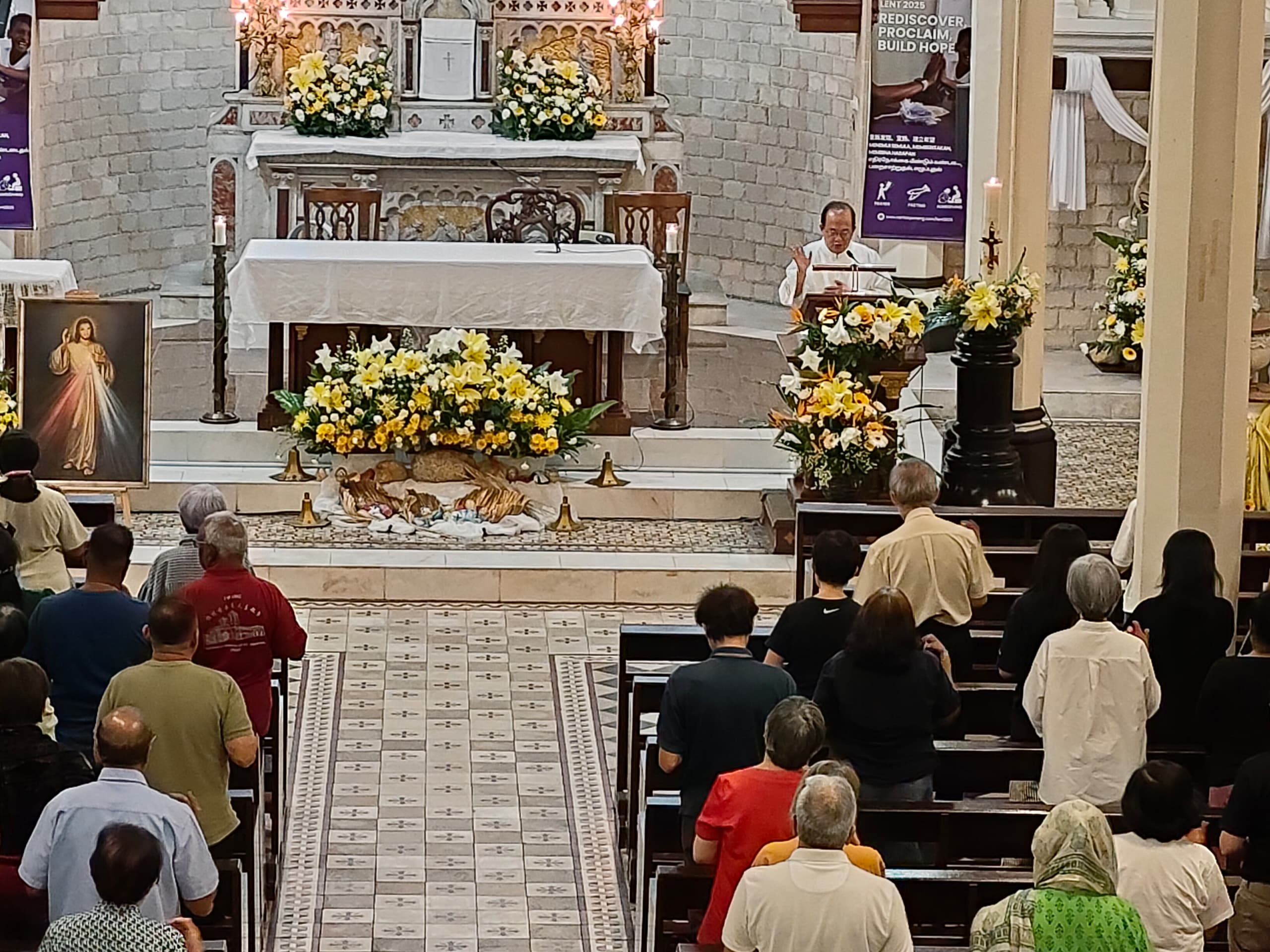 Catholics all over the world received the sad news of Pope Francis' passing on Easter Monday. The Holy Father passed away peacefully on the morning of 21st April 2025, in the aprtment where he resided in Domus Sanctae Marthae, Vatican City. SMC parish priest Fr Aloysius Tan then called upon SMC parishioners to pray for the repose of the soul of Pope Francis in the same evening of that day. Pope Francis was a man who truly embodied Christ in his life and his habits and was greatly admired by many, not only within the Catholic church. A book for parishioners to write their tributes was opened and placed in church before the prayers. This book will later be sent to the Apostolic Nuncio in Kuala Lumpur. Despite the short notice, many parishioners made their way to church in the evening to pay their respects and pray a rosary for the Holy Father. Prayers for the deceased will be held subsequently at every weekday mass culminating in a Memorial mass on Saturday (26/4/2025) at 12.00 noon. The Divine Mercy chaplet will then be prayed at 3.00 p.m. followed by the livestream (in church) of the funeral mass from Vatican City starting at 4.00p.m. The day will end with the sunset mass for Divine Mercy Sunday at 6.00p.m.