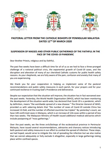 The Catholic Bishops of Peninsular Malaysia has issued a circular suspending all masses and public gatherings in church from 14th March to 29th March 2020.