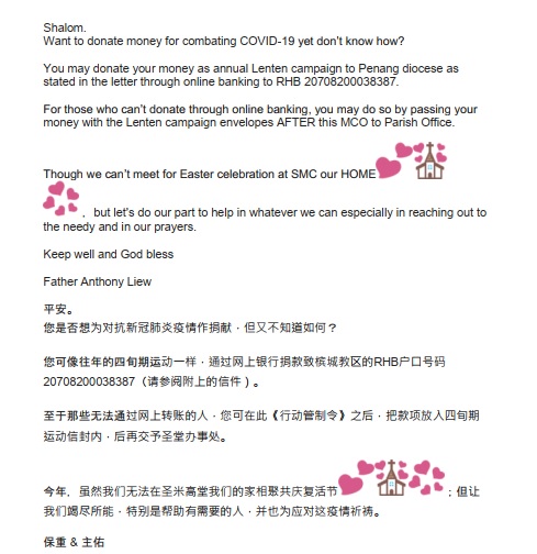 MESSAGE FROM PARISH PRIEST AND POHD - PENANG DIOCESAN LENTEN CAMPAIGN 2020